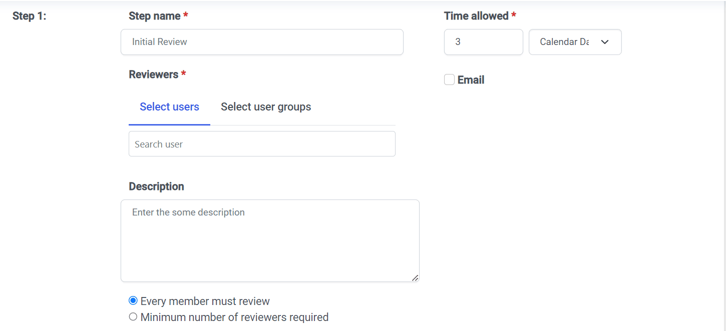 · Select one of the options between Ever member must review or Minimum number of reviewers required