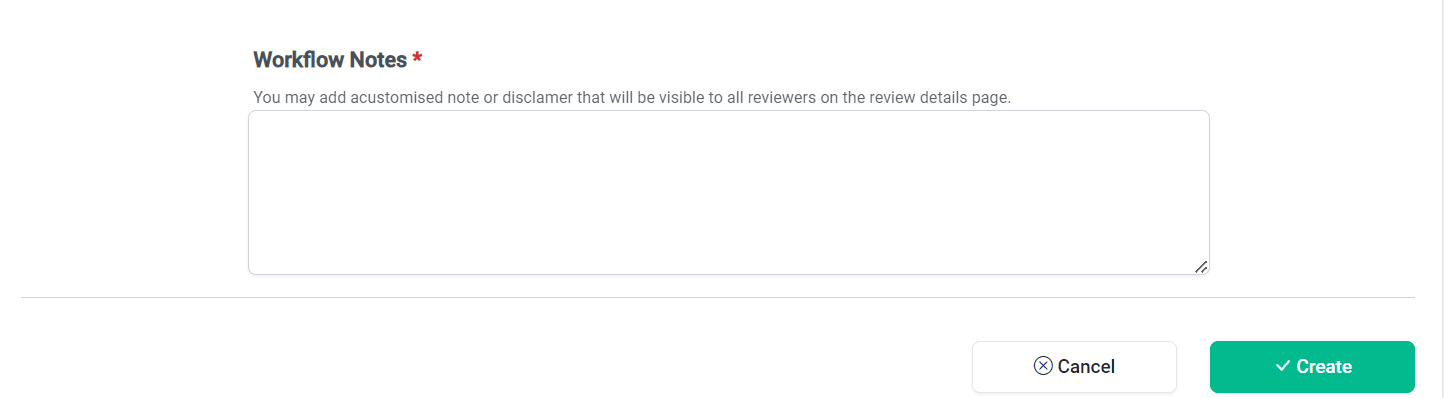 Workflow notes: Optionally, add a custom note, such as a disclaimer, which will be visible to all reviewers.