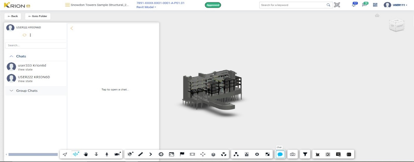 Chat tool in Krion 6D enables you to Chat with individual users or with a group of users. Clicking on the shows options to open existing Chat(s) or start a New Chat.