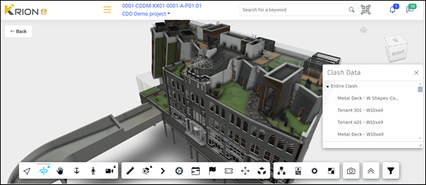 Clash tool in Krion 6D helps in analyzing intersections between models. When the supported documents are added and then viewed in the 3D viewing space, they are automatically analyzed and a clash data report is shown in a dialog. Each item in the Clash Data can be individually viewed on the 3D model and analysed.