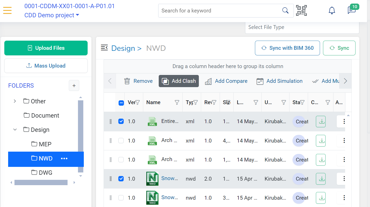 The .xml file and the .nwd file of the project should be already available under the same folder in the Documents section of a project. Select the required files and click on
