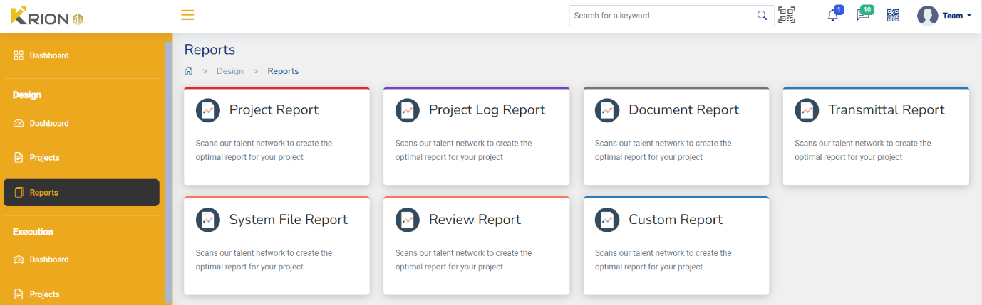 Krion6D application lets you create various reports in the Reports tool. The tool provides a central location for project members to view and share reports. With Reports, project members can communicate important project data and distribute this data among the people who need it most.