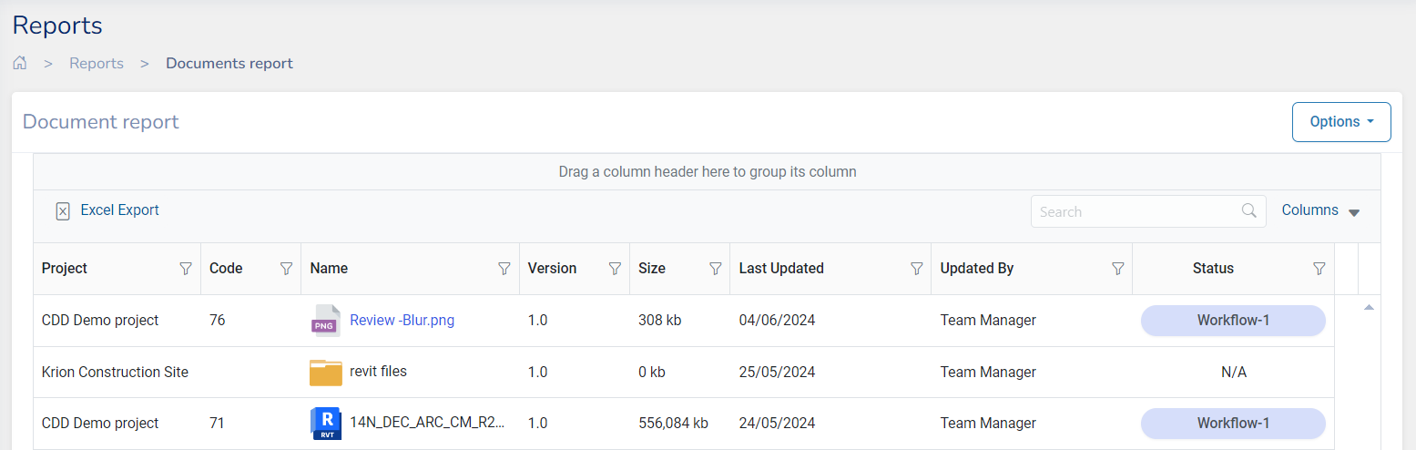 This report contains a list of all documents like Drawings, model files, and other PDFs related to all the projects.