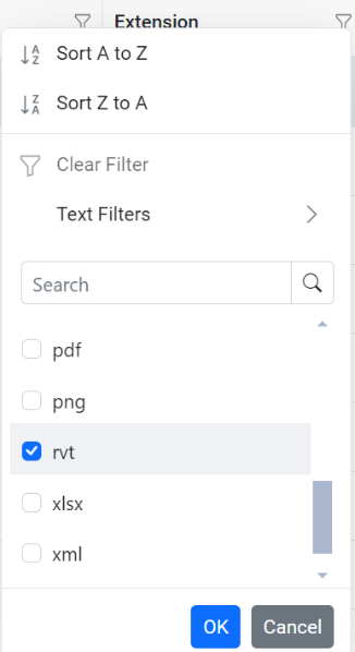 For example, if you want to filter .rvt files (Revit Files), click on the filter button of the Extension column and check on rvt.