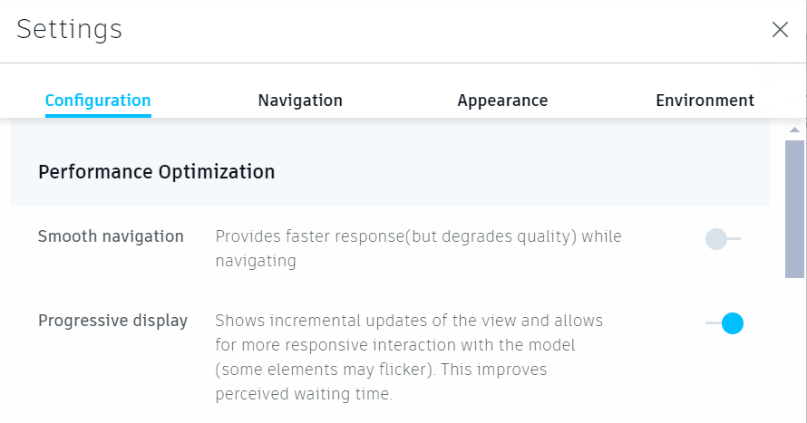 o Progressive display: Shows Incremental updates of the view and allows for more responsive interaction with the model (some elements may flicker). This improves perceived waiting time