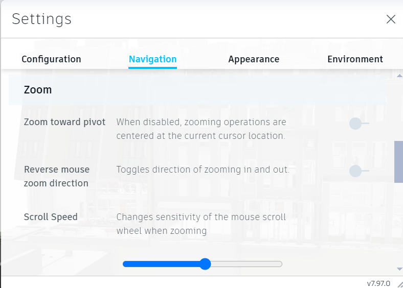 o Navigation Settings Adjust the controls and options related to navigating through the model or drawing, such as mouse sensitivity, keyboard shortcuts, or navigation modes.