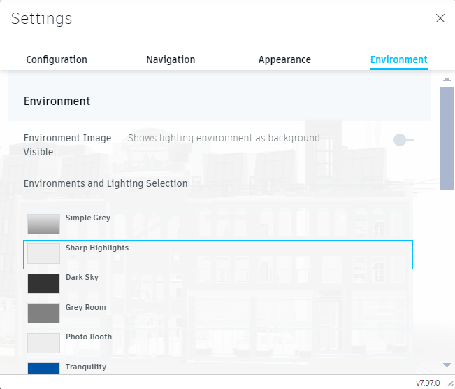 o Environment settings Configure environmental factors affecting the model, such as lighting conditions, background settings, ambient effects, and other environmental elements to simulate real-world conditions or enhance visualization.