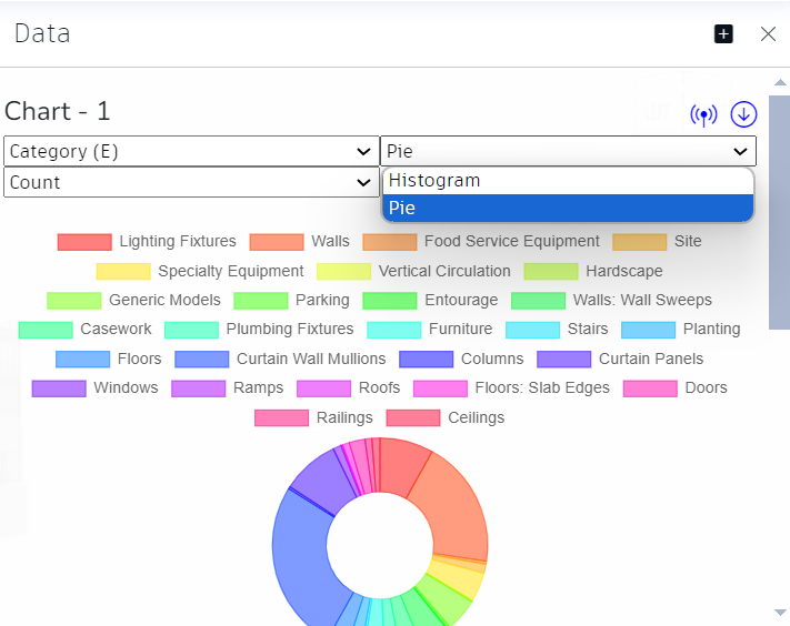 · For the Model Properties (Viz Area, Level, Length) that we have selected either Sum or Count of the elements can be shown in the Chart Data