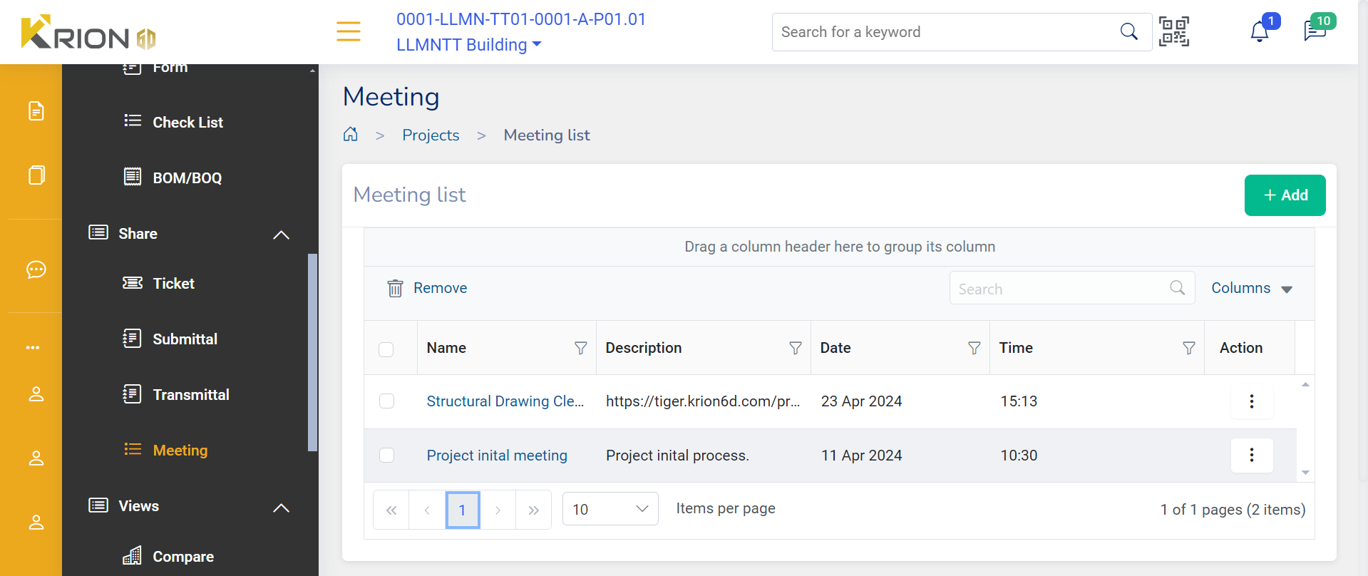 The meetings tool in Krion 6D helps in collaborating within project teams. The tool helps create meetings with required attendees and helps take notes/minutes of important points. It also allows necessary files to be added about the meeting