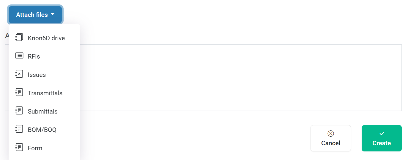 o Attach Files: Enables you to attach files from Krion6D, RFIs, Issues, Transmittals, RFAMs, BOM/BOQ or Forms pertaining to the project