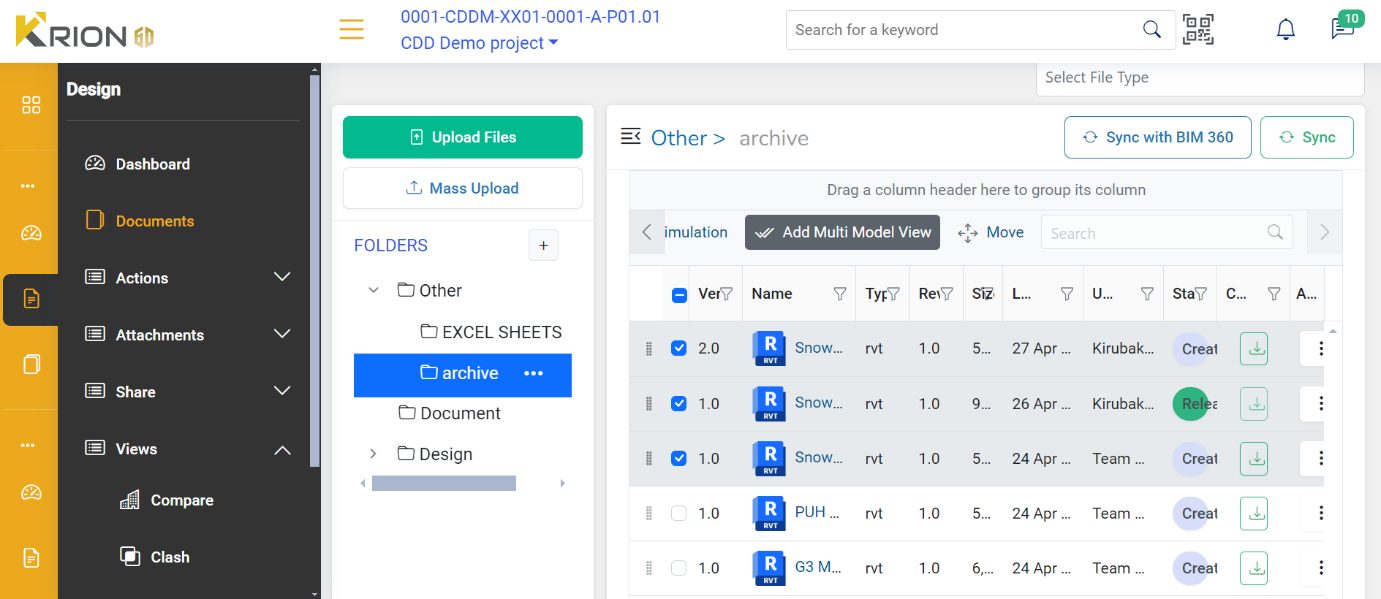 The required drawings for federating the model should be already available under the same folder in the Documents section of a project. Select two or more documents to federate and click on
