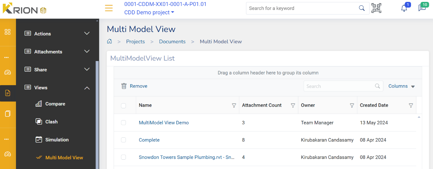 Navigate to Views under Projects and Click on Multi Model View . The “Multi Model Demo” document will be in the Multi-model View List. Select the file to view the comparison.