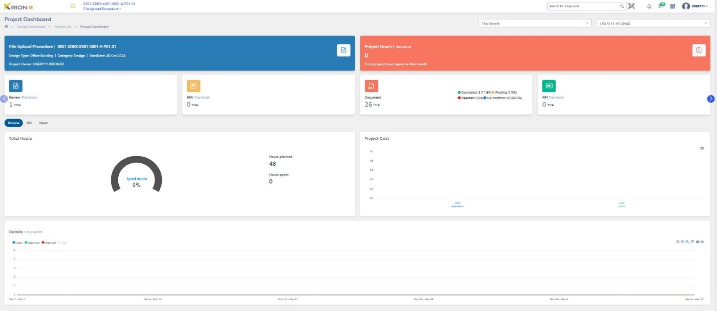 The project dashboard gives a snapshot of the Project hours spent and the Project cost. The details in the project dashboard can be viewed for a Week,Month, Year, or total. In addition to that it gives an overview of all elements related to a Project like the total Reviews, Documents (Both Pending and Completed), RFIs, RFAM, Issues, and Transmittals. Any item that needs attention can be accessed directly from the dashboard by clicking on the respective card.